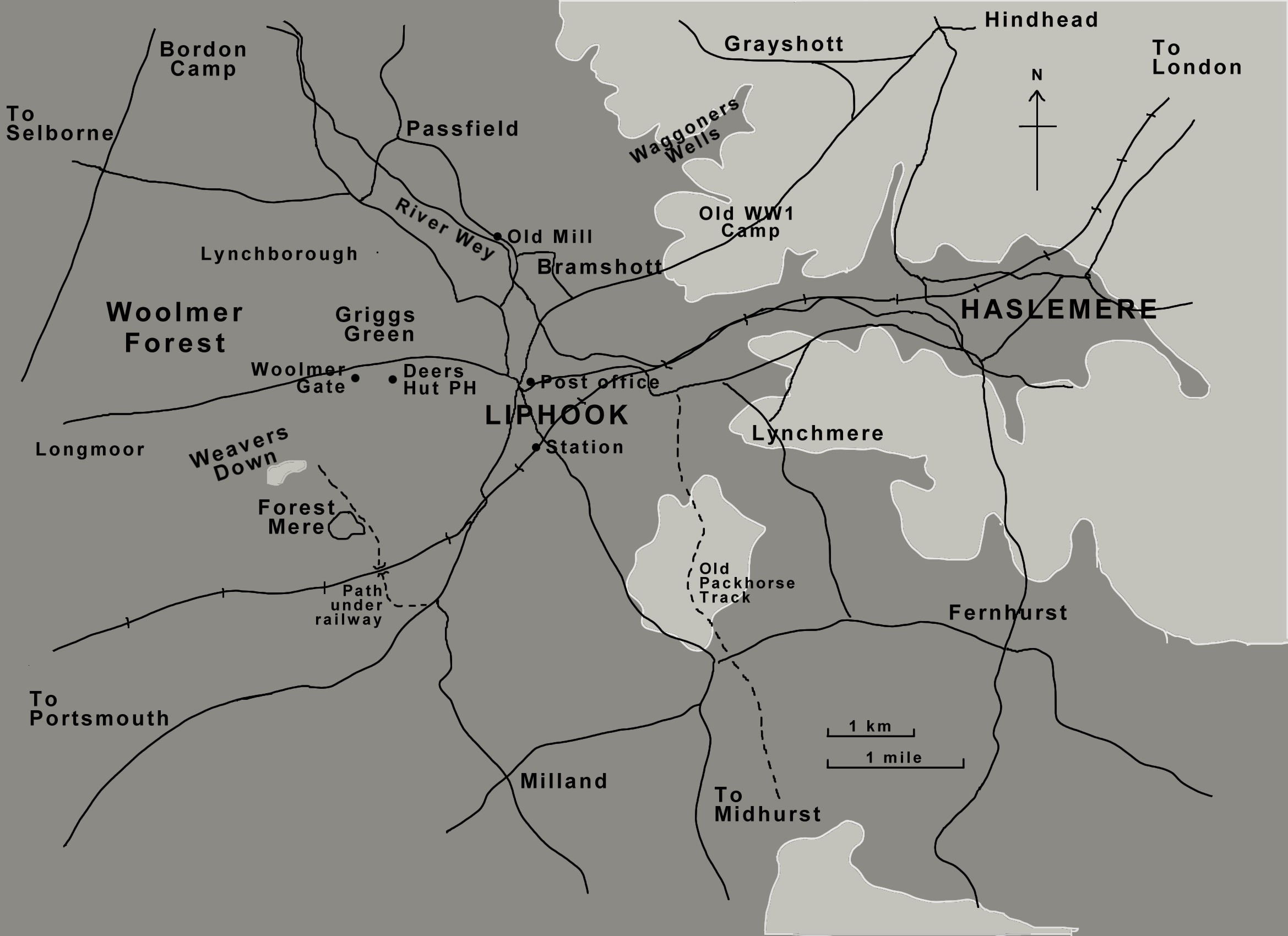 Map of the 'Peverel' district showing locations mentioned in the text. Lighter shaded areas are above 150m (500ft), including Weavers Down. Today's visitors should note that the Portsmouth Road (A3) from London now bypasses Liphook to the north and takes a route towards Longmoor. Click on map to enlarge |