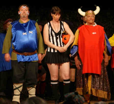 Great Scots! L to R: Birnam Wood (Jill Turner), Banquo (Pru Harrold) & Duncan (Martin Wellen) |