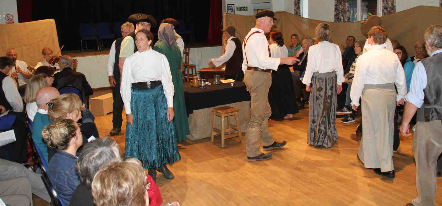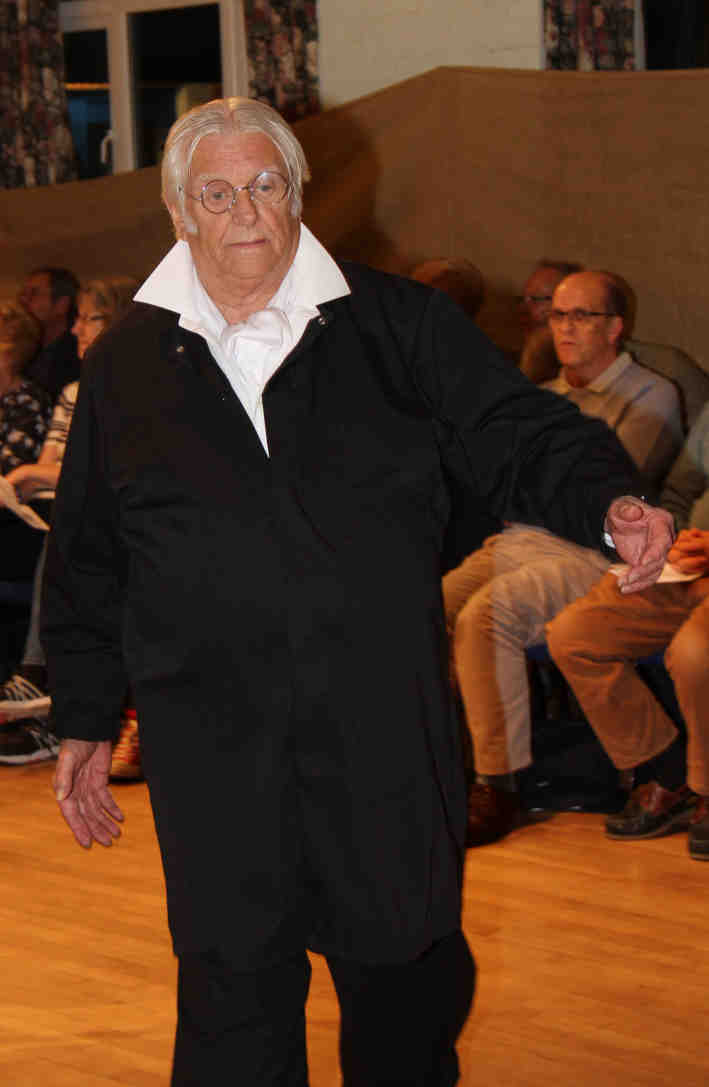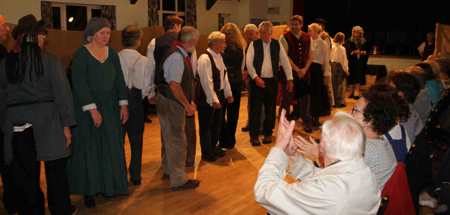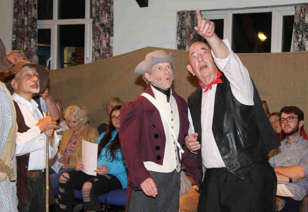 Eli Smith (Sorrel Wood), farmer of Headley, marches to the workhouse hoping for the help of bystanders (picked from the audience), but they just want to 'join in the fun'. |