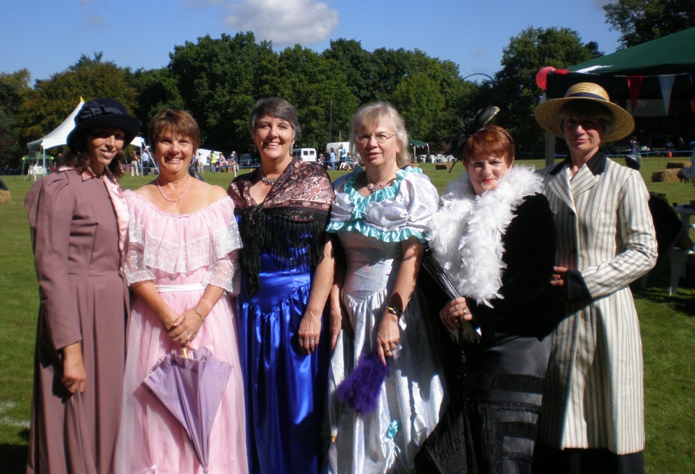 The main attraction for them was the Village Fete on Saturday – the sun smiled on us, and here on the right are our dramatic ladies all dressed up for the parade. We're not quite sure when we may expect to see ourselves on the small screen – some time next year I think. But some of us may not see it at all, as our TV aerials point the wrong way! |