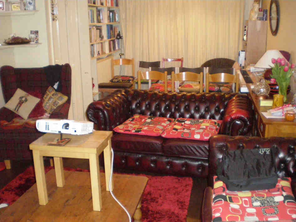 25th January 2016The panto's over… It went well, all in all. Audience numbers were slightly up on last year, and we've received many complimentary comments. On the Thursday between performances, we showed a DVD of the first Saturday night's performance to members of the cast, which we always find to be a useful exercise. Here's our lounge set up as a cinema for the occasion! |